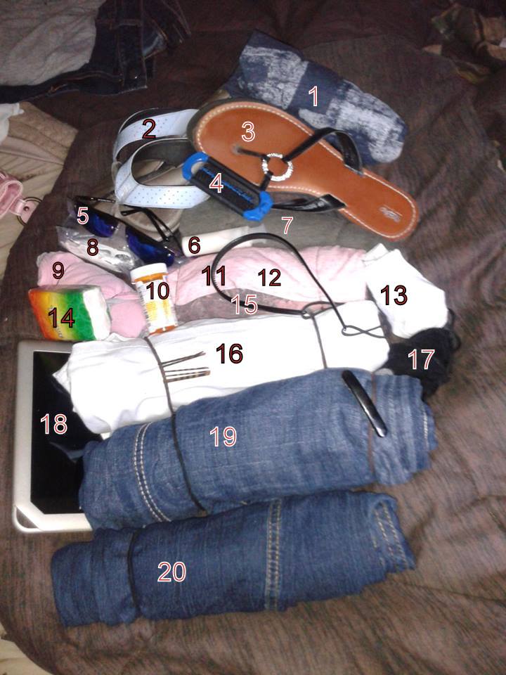 The trick is to wear your heaviest shoes/boots/sneakers on the plane (yes it's less convenient than wearing flip flops while checking in, but trust me, it's much more efficient) The most important part of packing is rolling everything up as tightly as possible. Spread out your clothes, make sure they're neat and not balled up then just roll from one end to the other. After I'd rolled them up, I used small hair elastics and large hair elastics to hold them - this way it's keeping everything neat, compact and I can throw my hair up into a ponytail. Also, I clipped a couple barrettes and a half dozen bobby pins on the elastics that I used to hold my clothes. Once you've rolled everything, it's important to put it in your bag as efficiently as possible....it may take some patience and rearranging but it can be done. Male sure you put heaviest items on the bottom and use every bit of space. I put the two pairs of sandals on the bottom and then packed and rearranged until everything fit neatly inside. And it's all within the airline's size requirements! Take that airline lol